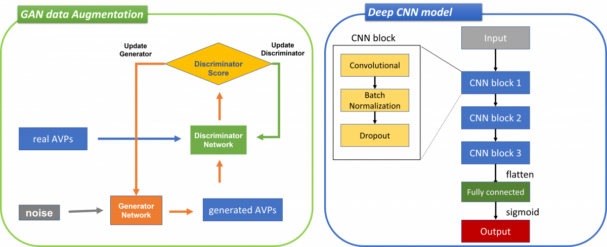 The model used for AI4AVP was proposed in our study, 'Developing an Antiviral Peptides Predictor with Generative Adversarial Network Data Augmentation' (BioRxiv, 2021).' We used a generative adversarial network (GAN) to generate a positive training dataset to allow the deep CNN classifier to train on balanced datasets. Then, we encoded peptides using the PC6 protein-encoding method and trained the AI4AVP model based on three CNN blocks.