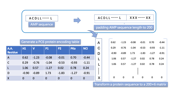 The idea of the PC6 encoding method is to use physicochemical properties as word embeddings. Each amino acid character in sequence would be replaced with a vector composed of six physicochemical property values (PC6). The six features of PC6 include hydrophobicity (H1), the volume of side chains (V), polarity (Pl), and pH at the isoelectric point (pI), the dissociation constant for the -COOH group (pKa), and the net charge index of the side chain (NCI) (detail in mSystems, 2021).