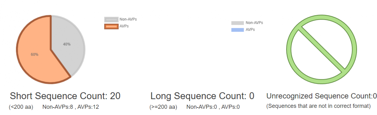 The pie charts above show the visualization of the results in a global view (Figure 4). There are a total of 20 peptides in the demo FASTA file, and the prediction result shows that it contains 11 AVPs and 8 Non- AVPs. Submitted long peptides (>200 aa) and unrecognized sequences are visualized and counted in separated piecharts. However, it must be emphasized that most AVPs composed of essential amino acids with a length shorter than 50 amino acids.